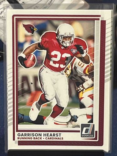 This is a standard 2.5 by 3.5 inch trading card featuring Garrison Hearst during his rookie tenure as a running back for the Arizona Cardinals. The card is produced by Donruss and utilizes a distinctive white, maroon, and silver color scheme. The central image depicts Hearst in a dynamic action pose, carrying a football and wearing his iconic number 23 red jersey and white helmet. A secondary player is visible in the background, partially obscured by the graphic design elements. The card face includes the official Arizona Cardinals logo in the top left and the classic 'D' Donruss logo in the bottom right corner. The text at the bottom clearly identifies the player and his position. Regarding condition, the card is housed in a clear protective sleeve, which has preserved its surface from significant scratching. The centering appears slightly heavy toward the left and bottom margins. The corners show original sharp factory cuts without visible fraying, and the edges appear clean. This piece represents the early 1990s era of sports card collecting, characterized by premium card stock and high-gloss photographic finishes. There are no visible ink marks, creases, or surface stains, suggesting a high technical grade for a modern collectible from this period.
