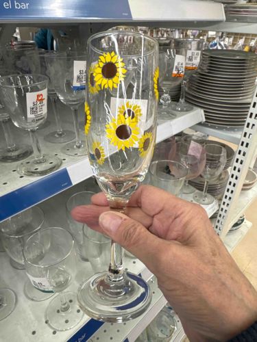 This item is a contemporary champagne flute crafted from transparent soda-lime glass, featuring a distinctive tulip-shaped bowl and a medium-length stem. The most notable aesthetic feature is the series of screen-printed sunflower motifs wrapped around the exterior of the bowl. These graphics utilize a vibrant palette of lemon yellow for the petals and deep chocolate brown for the seeds, bordered by white outlines for added definition. The glass construction appears to be machine-pressed rather than hand-blown, indicated by the uniformity of the stem and the thickness of the circular foot. The piece stands approximately 8 to 9 inches tall with a standard capacity for sparkling beverages. Regarding condition, the glass retains high clarity with no visible chips, cracks, or clouding; however, some micro-scratches may exist from retail handling. The decorative decals show consistent saturation without significant peeling or fading. While no visible maker's mark is present on the foot, the item appears to be mass-produced modern glassware, likely dating from the 1990s to the early 2000s, typical of kitchenware brands or boutique gift sets. The craftsmanship is functional and casual, positioning it as an everyday decorative item rather than fine crystal collector's ware.