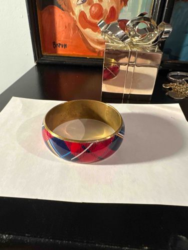 This item is a wide, continuous circular bangle bracelet featuring a classic tartan or plaid pattern in a vibrant color scheme of red, navy blue, white, and yellow. The exterior surface is finished with a smooth, domed enamel coating that creates a glossy, reflective sheen over the patterned design. The interior of the bracelet reveals a base metal construction, likely brass given the yellowish-gold hue, which appears to have a brushed or matte texture. In terms of dimensions, the bangle has a significant width (likely between 0.75 and 1 inch), giving it a bold, statement-piece aesthetic characteristic of mid-to-late 20th-century costume jewelry. Regarding condition, the interior shows visible signs of age including surface oxidation, darkening (patina), and minor spotting typical of vintage brass. The outer enamel appears largely intact, though fine surface scratches from handling may be present upon closer inspection. There are no obvious maker's marks visible in the provided image. The style is reminiscent of preppy or equestrian-inspired fashion popularized in the 1970s and 1980s by brands like Coach or Burberry. The construction is solid and heavy, indicating a decent level of mass-manufactured craftsmanship for the era.