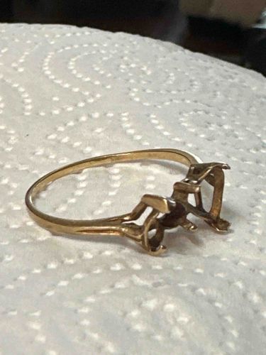 This item is a yellow gold ring mounting, specifically designed for a three-stone setting, lacking its primary gemstones. The mounting is constructed from what appears to be 10k or 14k yellow gold, featuring a polished finish that shows evidence of light surface scratches and wear consistent with age and use. The structure consists of a slender, polished band that splits at the shoulders to support the multi-prong settings. The central setting is flanked by two smaller side settings, each featuring four prongs intended to secure faceted stones such as diamonds or sapphires. The prongs appear slightly bent and unpolished, suggesting the stones were previously removed or the piece was a semi-mount never finished. There are no visible maker's marks or hallmarks from this angle, though they would likely be found on the interior of the shank. The style is classic and minimalist, likely dating from the late 20th century. The overall condition is fair to good, requiring professional cleaning, prong straightening, and stone setting to be restored to a wearable state.