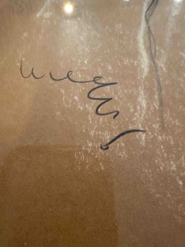 This item features a series of loopy, cursive-style markings executed in black ink, possibly using a fine-nib pen or marker, set against a medium-brown, textured, toned paper support. The markings are fluid and suggest a quick, gestural execution, characteristic of an abstract signature or a spontaneous scribble often found in modernist or contemporary art. The paper substrate shows a visible grain and significant surface texture, with prominent white 'foxing' or bloom-like spotting scattered across the surface, which could indicate mold growth, mineral deposits, or pigment degradation from moisture exposure. A dark vertical line is visible on the right edge, hinting at a compositional border or part of a larger figurative work. The image appears to be taken behind glass or a reflective protective layer, as evidenced by a bright, warm-toned light flare at the top and a shadowy reflection in the lower-left quadrant. This suggests the piece is framed. The style is reminiscent of mid-to-late 20th-century charcoal or ink sketches, though the poor condition of the paper surface significantly impacts its aesthetic and physical integrity. No distinct signature is legible, but the markings themselves serve as the primary focal element.