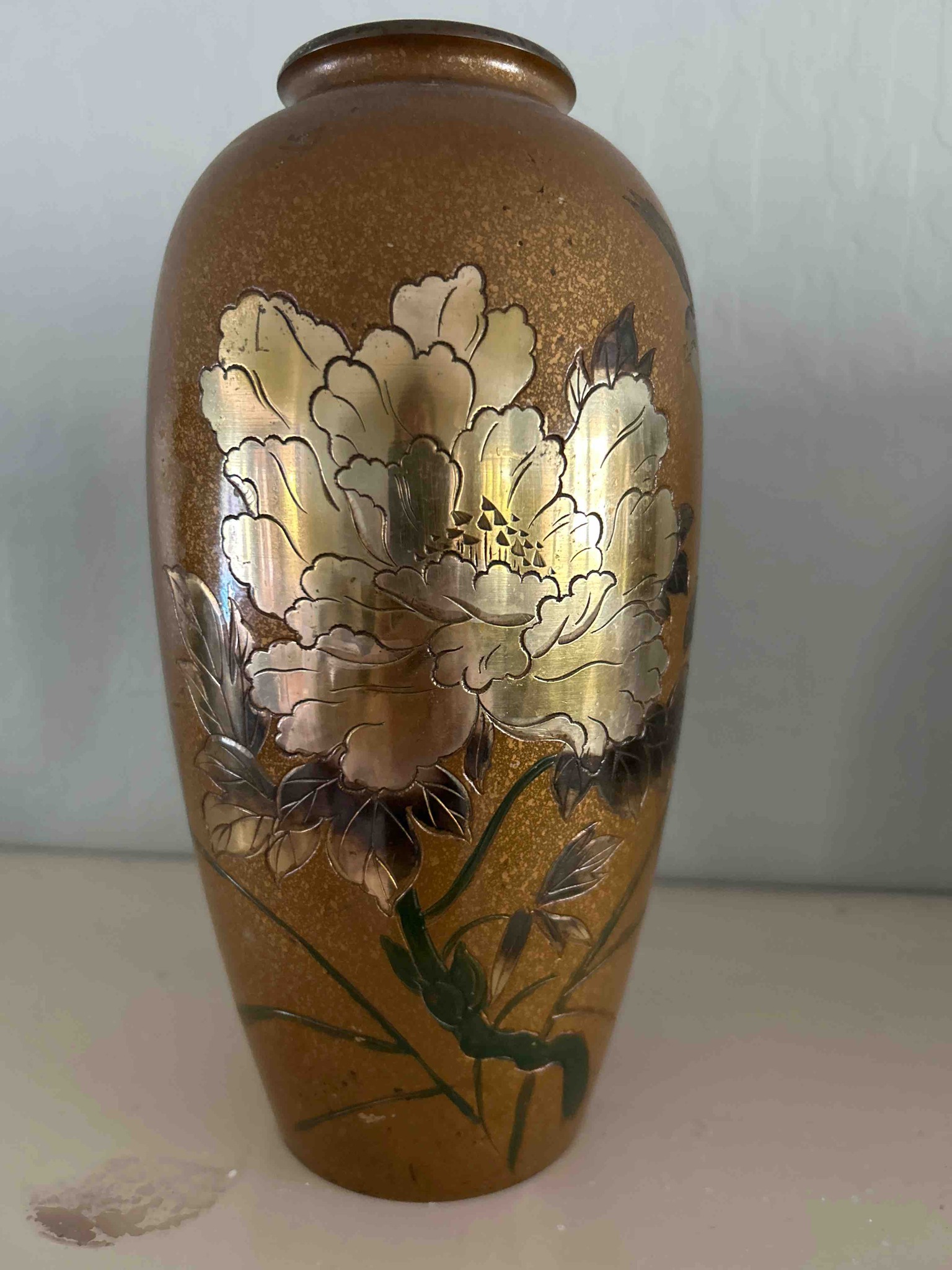 This is a detailed Japanese cloisonné enamel vase, likely dating from the Meiji or Taisho era (late 19th to early 20th century). The vase features an ovoid form with a narrow mouth and a slightly flared, short neck. The background is a textured, golden-orange 'speckled' enamel finish that mimics the look of aventurine or stone. It is decorated with a prominent, large-scale peony blossom. The central flower is executed in a metallic silver finish, utilizing techniques reminiscent of ginbari (foil-backed enamel), where the lustrous silver reflects light through the translucent petals. The petals are finely outlined with gold-tone wire (cloisons). Dark green stems and stylized leaves provide a deep contrast to the bright metallic peony. The craftsmanship is of high quality, demonstrating intricate metalwork and layered enamel application. Regarding condition, there are visible surface scuffs, small pits, and minor scratches consistent with age, particularly near the shoulder and base. Some oxidation or tarnish is visible on the exposed metal rim at the mouth. The overall construction is solid, likely featuring a copper or bronze body beneath the enamel layers. The base appears steady, though it shows surface grime that should be professionally cleaned to prevent further deterioration of the finish.