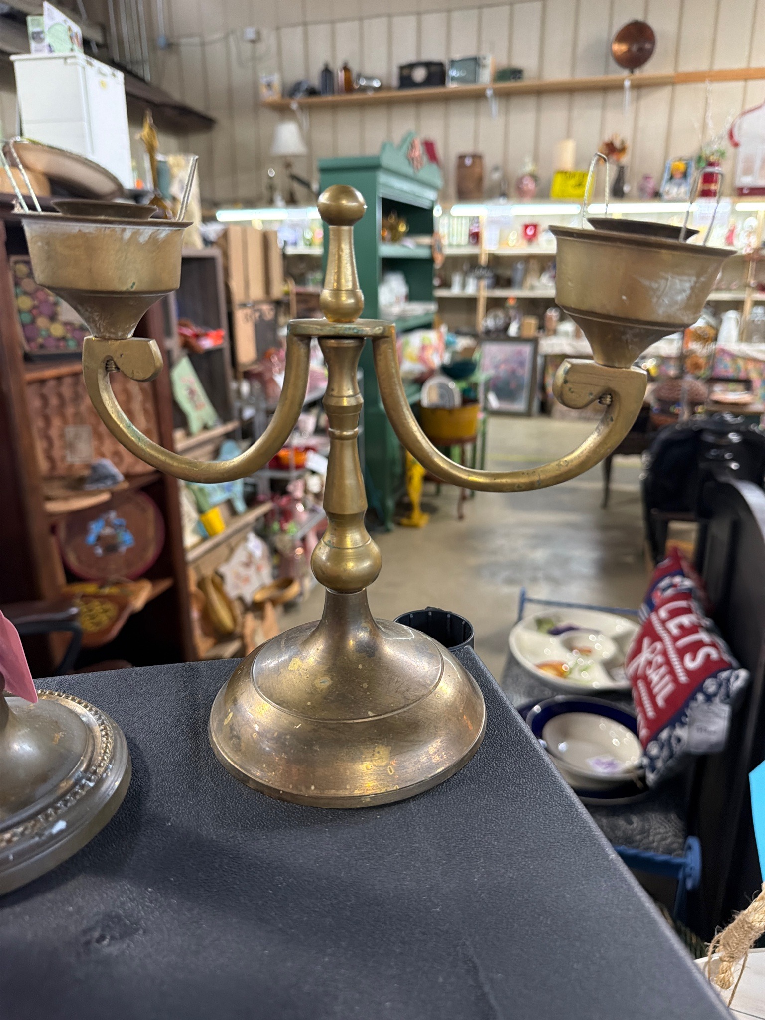 This is a vintage two-arm (three-light) candelabra crafted from solid yellow brass. The piece features a traditional baluster-style central stem terminating in a rounded finial, supported by a weighted, domed circular base. Two gracefully curved, S-scroll arms extend from the central column, each supporting a wide candle cup with a flared rim. The metal displays a heavy natural patina consistent with age, including areas of darkening, oxidation spots, and some verdigris particularly evident inside the cups. Surface wear is visible throughout in the form of fine scratches and minor pitting. Each candle cup contains a wire-prong insert, likely intended for securing larger pillar candles or specialized shades. The construction suggests a mid-20th-century manufacture, typical of colonial revival or traditional European styles. There are no visible maker's marks or signatures on the upper surfaces, though such stamps are often found on the underside of the base. The overall craftsmanship is sturdy, reflecting a mass-produced but high-quality decorative metalware item designed for longevity.