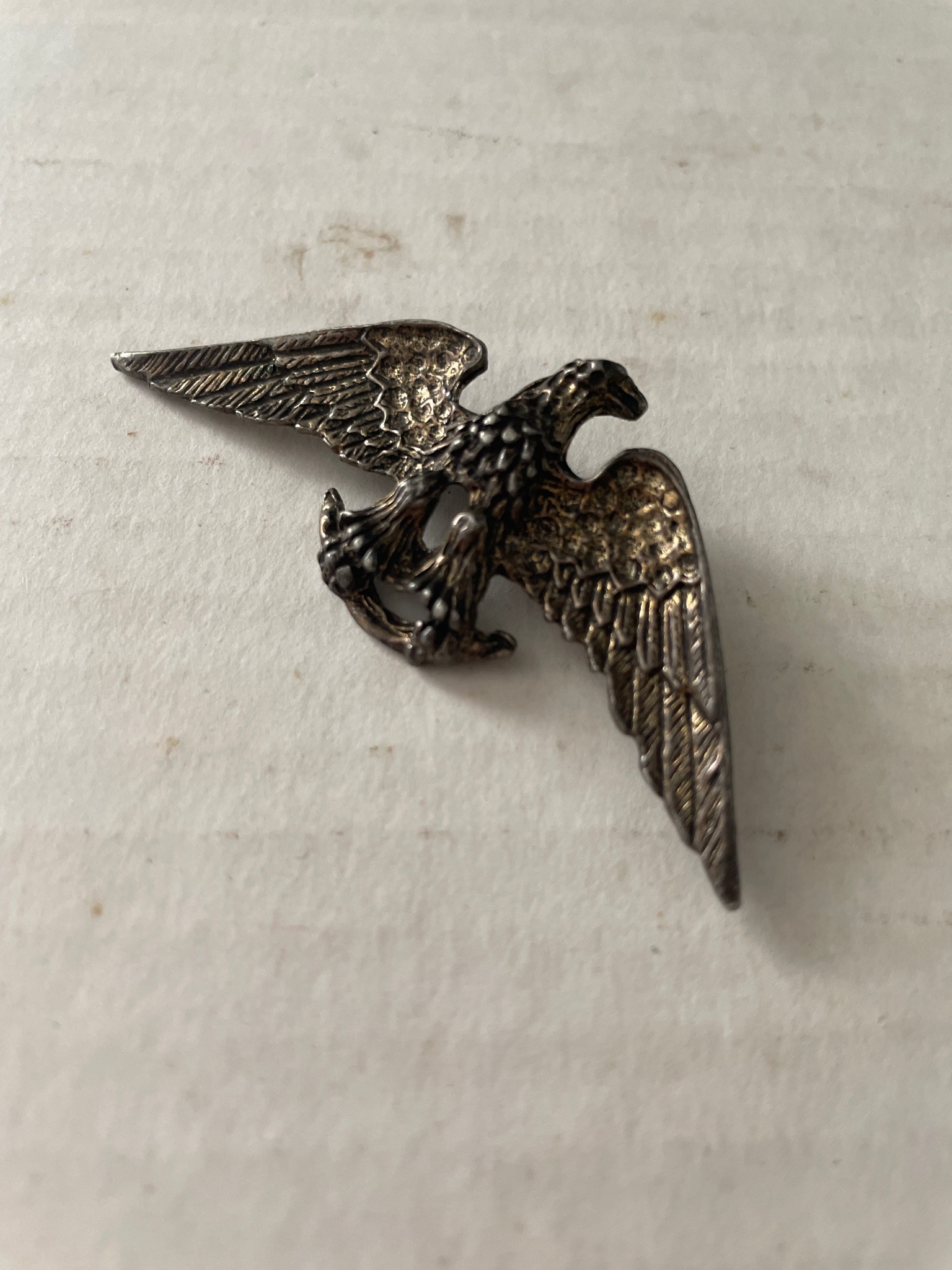 This is a vintage metal brooch or pin depicting a bald eagle in flight or preparing to perch. It is constructed from an antiqued silver-toned metal, likely pewter or a pot metal alloy, featuring a high-relief die-struck or cast design. The wings transition from detailed primary feathers at the tips to a stippled or textured pattern near the body, indicating mid-century costume jewelry manufacturing techniques. The eagle is shown with its head turned to the right and its talons clutching what appears to be a stylized branch or partial wreath. In terms of condition, the piece shows significant surface oxidation and a dark patina within the recessed areas, which serves to emphasize the textural details of the feathers. There is visible wear on the high points of the design, consistent with age and frequent handling. No maker's marks or metal fineness stamps (like 'Sterling') are visible from the front view, suggesting it may be a mass-produced commemorative or fashion piece from the 1940s to 1970s. The level of craftsmanship is moderate, focusing on a realistic yet stylized representation of the heraldic eagle. The overall aesthetic is consistent with patriotic Americana accessories or military-inspired costume jewelry, likely dating from the mid-20th century.