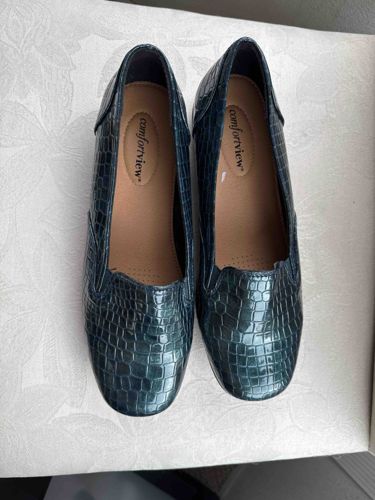 This pair of women's loafers is finished in a high-gloss patent material featuring a deep metallic teal or forest green hue with a pronounced crocodile-embossed texture. The shoes are designed in a classic slip-on loafer style with a rounded toe and a slight heel. The uppers are constructed from a synthetic patent material, likely a man-made PU, displaying a uniform scale pattern across the toe and sides, while the heel counter consists of a smooth textured patch of the same color. Internally, the shoes feature padded tan insoles clearly printed with the 'comfortview' brand logo. Notable craftsmanship details include tonal topstitching along the topline and structural seams, and subtle perforated arch supports on the inner sole. In terms of condition, the shoes appear well-preserved with a high-luster finish; however, there is a visible white scuff mark on the interior side of the right shoe's vamp and minor creasing at the natural flex point of the toes. These shoes are contemporary in style, likely manufactured within the last 5-10 years, and are designed for utility and comfort as indicated by the brand's name and the generous interior padding.