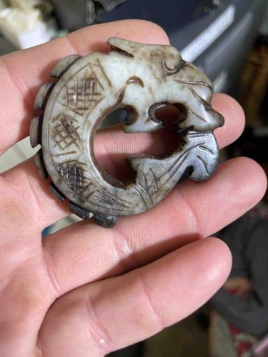 A hand-carved jade or nephrite pendant meticulously shaped into an archaic 'C-shaped' dragon or 'pig dragon' (Zhulong) motif, characteristic of designs from the Hongshan culture. The item is approximately 2 to 2.5 inches in diameter, featuring a pale celadon or grayish-white base stone. It exhibits significant surface calcification, earthy inclusions, and a dark brown to blackish patina within the recessed carvings, which suggests an attempt to replicate an ancient buried appearance. The carving displays traditional iconography including large circular eyes, a prominent snout, and a stylized mane or dorsal fin. The body is decorated with incised cross-hatched diamond patterns and linear grooves. Condition-wise, the piece shows intentional distressing, minor surface abrasions, and deep-set oxidation. While modeled after Neolithic period artifacts, the quality of some of the sharper incised lines and the specific nature of the surface staining may indicate a contemporary or 20th-century artisanal reproduction meant for the collector market rather than an authenticated archaeological find. The craftsmanship shows a mix of hand-finishing and potential mechanical tooling in the deeper penetrations.
