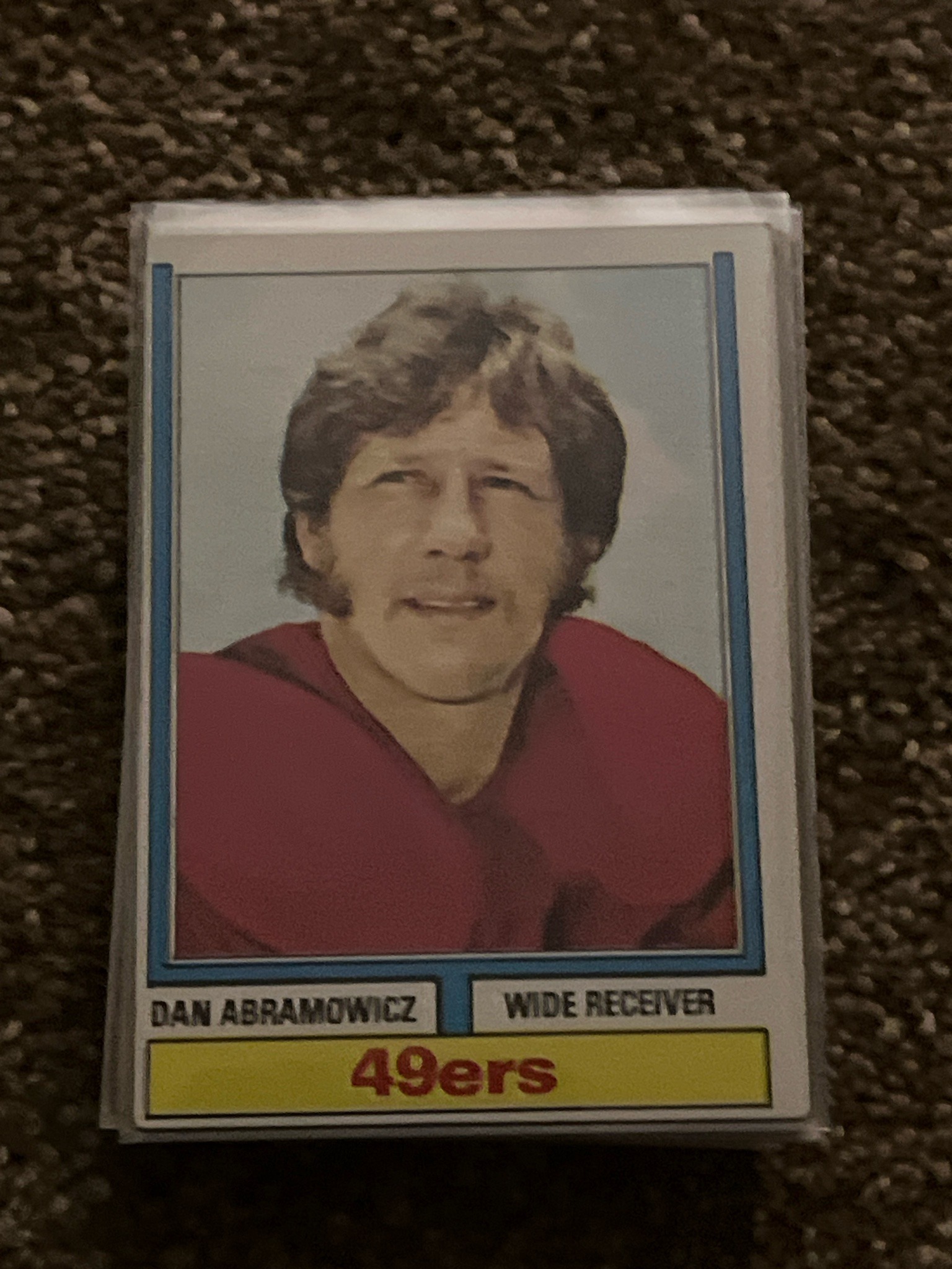 This is a vintage 1974 Topps football trading card featuring Dan Abramowicz, who played as a Wide Receiver for the San Francisco 49ers. The card follows the distinctive 1974 design aesthetic, characterized by a large color photograph set within a thin blue inner border and a thick white outer border. At the bottom, a yellow banner contains the team name '49ers' in red block lettering. Above the banner, two separate compartments display the player's name and position in black sans-serif typeface. The card is made of standard cardboard stock from the mid-1970s. Regarding condition, the card appears to be housed in a protective clear plastic sleeve. The centering appears slightly shifted toward the top-right. The corners show minor softening, which is typical for a card of this age. The color saturation remains strong, though there is a Slight tint consistent with the printing technology of the era. This card is a notable piece of NFL memorabilia from the 'junk wax' precursor era, representing a player known for his steady hands and consistent performance during his tenure with the Saints and 49ers.
