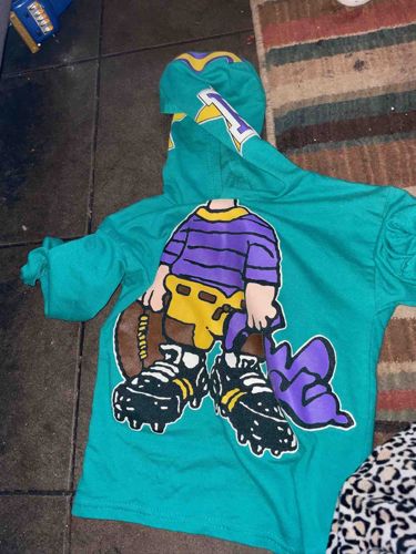 This item is a long-sleeved hooded sweatshirt, primarily teal in color, featuring a prominent graphic on the front. The image displays a headless cartoon character dressed in football attire, including a purple and black striped jersey, yellow pants with pads, and black cleats with yellow accents. The character is holding a brown football under one arm and a purple cloth or jersey in the other hand. The graphic style is reminiscent of 1990s urban fashion, utilizing bold black outlines and a vibrant color palette of teal, purple, yellow, and black. A large 'L' in gold and purple is visible on the side of the hood. The material appears to be a cotton or polyester-blend fleece, common for casual athletic wear. No specific brand tags or manufacturing labels are visible in the image, but the overall design suggests a contemporary recreation or a vintage piece from the late 20th century street-wear era. The craftsmanship includes ribbed cuffs and a finished hem. Condition-wise, the garment appears used, with visible wrinkles and slight pixelation on the printed graphic, though the colors remain moderately saturated. The garment is shown lying flat on a darker flooring surface next to a striped rug.