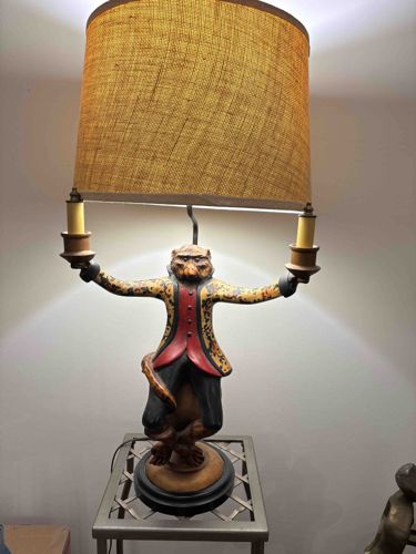 This is a decorative table lamp featuring a whimsical singerie-style monkey figure dressed as a butler. The central figure is likely constructed from cast resin or composite material, meticulously hand-painted with a multi-color palette. The monkey is depicted in a standing post with legs crossed, wearing a yellow patterned frock coat with red trim and black trousers. Each arm extends outward to hold a faux-candle light socket, creating a symmetrical two-light configuration. A curved metal support rod extends from behind the monkey's head to secure a large, cylindrical drum shade made of a coarse-weave burlap or jute fabric in an amber-brown tone. The entire figure sits atop a tiered circular base with a black finish. This piece draws inspiration from 18th-century French Chinoiserie and Singerie art trends where monkeys were depicted in human clothing and activities. Based on the construction and the use of faux-wax sleeve candle covers, this is likely a late 20th-century decorative piece. The condition appears fair to good, with some visible paint wear and scuffing on the figure's coat and hands, suggesting a vintage patina rather than modern damage. The shade shows a slight tilt, indicating a potential need for adjustment to the metal harp hardware. The craftsmanship reflects a high-quality novelty decor item designed to serve as a conversational statement piece.