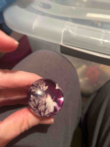 This item is a vintage circular button, approximately 1 inch in diameter, constructed from translucent purple Lucite or acrylic resin. The button features a sophisticated reverse-carved intaglio design depicting a cluster of maple leaves. The design is carved into the back of the button and then filled with a white pigment, creating a three-dimensional effect when viewed through the polished dome of the front surface. The purple color of the material is vibrant, showing deep amethyst hues where the plastic is thicker. The craftsmanship indicates mid-20th-century production, likely from the 1940s or 1950s, a period when novelty plastic buttons were highly fashionable. Physically, the piece appears to be in excellent vintage condition with a smooth, glossy surface and no deep scratches or crazing visible on the face. There is no visible maker's mark, which is common for these types of mass-produced yet high-quality decorative accessories. The fine details in the leaf veining demonstrate high-quality mold work or hand-finishing characteristic of premium vintage costume hardware.