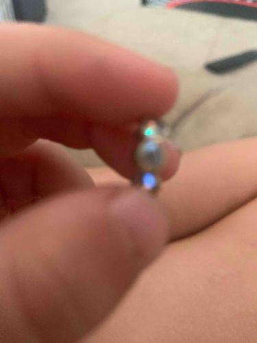This item is a small ring, likely a piece of costume jewelry, held between two fingers. Due to the significant lack of focus in the image, fine details are obscured, but the basic architecture can be discerned. The ring features a three-stone setting oriented vertically or along the band, with a larger central circular element flanked by two smaller circular elements. The stones demonstrate an iridescent or 'Aurora Borealis' (AB) finish, characterized by flashes of blue, green, and pink light, which is common in mid-century to modern costume jewelry utilizing coated glass or synthetic resins. The metal setting appears to be a light-colored material, potentially silver-toned base metal or sterling silver, though no hallmarks are visible to confirm composition. The craftsmanship appears to be commercial grade, common for fashion accessories. The condition seems fair, though the blur makes it impossible to detect surface scratches or looseness in the prongs. The style is reminiscent of mid-20th-century 'past, present, future' designs, though the material suggests it is a more recent mass-produced fashion piece.