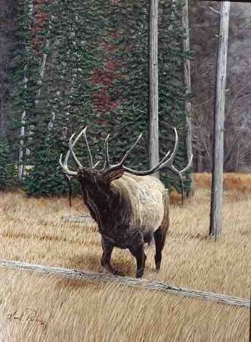 This original wildlife artwork is a 16” x 24” acrylic painting executed on a Masonite board by professional wildlife artist Neal Parker in 1989. The composition features a central, dominant bull elk in a bugling pose, rendered with masterful anatomical precision. The palette utilizes a refined range of earthy ochres, deep ambers, and forest greens to depict a mountainous forest edge during the autumn rut. The elk's fur is textured with fine brushstrokes to differentiate between the coarse, dark neck mane and the lighter, tawny flank. The massive antlers are portrayed with realistic highlights and depth, showcasing the animal's physical power. The background consists of vertical charred or weathered tree trunks and dense evergreens, perhaps indicating a regenerating burn area, which adds verticality to the scene. The low-growth yellow grasses in the foreground are meticulously detailed, providing a sense of depth and place. The artist’s signature, 'Neal Parker,' is clearly visible in the lower-left corner in a fluid, cursive style. The surface condition appears Excellent, showing no immediate signs of flaking, delamination from the Masonite, or significant UV fading. The technique reflects the high-quality realism found in North American wildlife art of the late 20th century, utilizing the fast-drying properties of acrylics to build complex layers of texture and light. This piece serves as a characteristic example of Parker's dedication to naturalistic detail and sporting subjects.