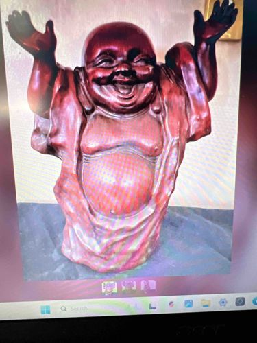 This item is a sculptural representation of the Laughing Buddha, also known as Budai or Hotei, a popular figure in East Asian folklore and Buddhism. The statue is depicted in a joyous standing pose with both arms raised overhead, symbolizing the attainment of happiness and abundance. It features the characteristic potbelly, broad smile, and elongated earlobes that signify wisdom. The material appears to be a reddish-brown wood or a cast resin finished to mimic rosewood or cinnabar, exhibiting a deep, lustrous patina and smooth, polished surfaces throughout the facial features and torso. The robe is draped loosely, showing significant movement and deep carving in the folds. Notable features include the highly detailed facial expression with squinted eyes and an open mouth. The condition appears fair to good; there are visible surface artifacts suggesting a moiré pattern from the digital display it was photographed from, but the physical item shows small scuffs and minor wear around the base consistent with age. This style is often found in mid-20th-century decorative arts, likely of Chinese or Southeast Asian origin. The craftsmanship shows a high level of detail in the expressive anatomy and flowing drapery, making it a desirable piece for collectors of Asian art or spiritual decor.
