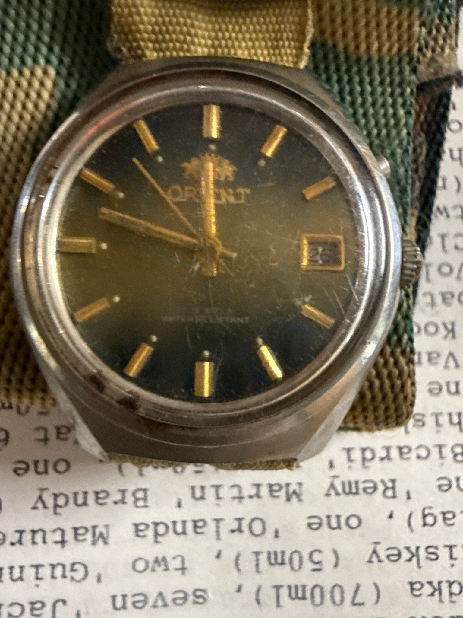 This is a vintage Orient automatic wristwatch characterized by a robust, brushed stainless steel tonneau-shaped case. The dial features a gradient 'sunburst' finish that transitions from a light olive or gold center to a deep charcoal or black perimeter. It is adorned with applied gold-tone baton hour markers and a matching gold-tone handset, including a thin seconds hand. The Orient signature logo, featuring two lions holding a shield under a crown, is positioned prominently below the 12 o'clock marker. A date aperture is visible at the 3 o'clock position with a gold-tone frame. Text at the bottom of the dial indicates '21 JEWELS' and 'WATER RESISTANT'. The watch shows significant signs of age and wear; the acrylic or mineral crystal is heavily scratched and scuffed across its surface. The stainless steel bezel and case show minor dings and a dulling of the original finish consistent with long-term use. There is visible dirt and patina buildup around the crown and case edges. It is currently paired with a camouflage-patterned textile or nylon strap which is likely an aftermarket replacement. This style of Orient watch typically dates from the 1970s to early 1980s, reflecting the era's preference for bold, mechanical sports watches.