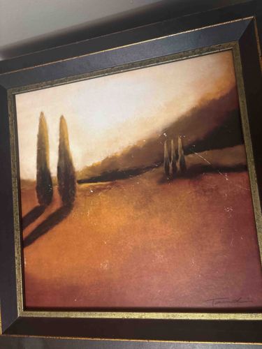 This item is a contemporary square landscape artwork, likely a high-quality giclee print on canvas or textured paper, mounted in a substantial decorative frame. The composition features a Tonalist-inspired Tuscan scene with two prominent cypress trees in the foreground casting long shadows and a cluster of three smaller trees in the mid-ground. The palette is dominated by warm earth tones, including sienna, burnt orange, and deep brown, transitioning to a hazy, cream-colored sky that suggests a sunrise or sunset. A stylized signature, 'Tandi', is visible in the lower right corner, which is associated with decorative artists sold through galleries and high-end home decor retailers. The piece is housed in a modern wide-profile frame finished in matte black with a distressed gold-toned inner lip (fillet) that adds a touch of classic elegance. In terms of condition, there are several visible white linear scuffs or scratches across the center and right side of the image surface, which disrupt the ink layer. The frame shows minor edge wear consistent with handling. This style is characteristic of late 20th to early 21st-century interior design trends focusing on Mediterranean aesthetics.