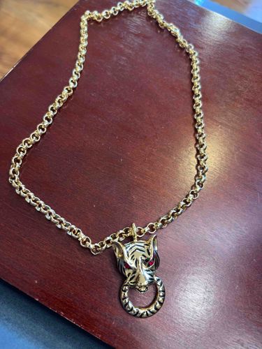 This fashion jewelry piece features a gold-tone rolo-style chain supporting a highly detailed pendant shaped as a tiger head. The pendant is constructed in a high-polish yellow metal finish, likely gold plating over a base metal alloy. The tiger motif is defined by black enameled stripes that follow the mechanical curvature of the face and ears, giving it a three-dimensional feline aesthetic. Its eyes are set with faceted red marquise-cut glass or synthetic stones, providing a sharp contrast. Beneath the jaw, the tiger holds a ribbed circular ring (door knocker style), also accented with black enameling. The rolo chain consists of uniform, thick round links, suggesting a style popular in the late 20th century, specifically the 1980s or 1990s, reminiscent of designs by Kenneth Jay Lane or Gucci. Condition-wise, the plating appears bright with minimal surface scratching, though slight wear is visible on the connection points between the pendant bail and the chain. The craftsmanship is indicative of high-end costume jewelry, where substantial weight and clean enamel application take precedence over precious material use. No maker's marks are visible in the primary view, but the design aligns with vintage 'animalier' style costume collections.