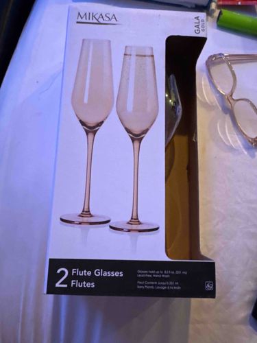 This item is a boxed set of two Mikasa 'Gala Gold' champagne flutes. Each flute is crafted from lead-free glass and features a distinctive elongated, angular bowl that tapers toward the rim, designed to optimize the effervescence of sparkling wines. The most notable physical characteristic is the elegant rose-gold or pinkish tint applied to the glass, providing a modern and luxurious aesthetic. The stems are exceptionally long and slender, attached to a flat, circular base for stability. According to the packaging specifications, each glass has a capacity of 8.5 fluid ounces (251 mL). The craftsmanship is consistent with contemporary high-end glassware, utilizing precision machinery for a seamless construction between the bowl and stem. The item is presented in its original retail display box, which features a white and black color scheme with high-quality photographic graphics of the product. The branding for 'MIKASA' and the 'GALA GOLD' collection is clearly visible at the top. The packaging indicates a requirement for hand washing, suggesting a delicate metallic or tinted finish that could be damaged by abrasive detergents. The condition of the visible packaging shows minor shelf wear, with some slight scuffing and rounding at the corners, but the internal product appears to be in new, unused condition without chips, cracks, or visible defects.