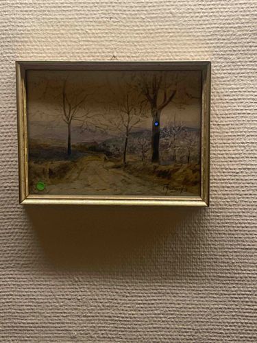 This is a horizontal rectangular landscape painting, likely an oil or gouache on board, signed in the lower right corner by the artist René Legrand. The composition depicts a serene, rural path or lane winding through a cluster of barren trees under a muted, overcast sky. The palette is dominated by earthy tones including ochre, burnt umber, and soft greys, suggestive of a late autumn or winter scene. The brushwork exhibits impressionistic qualities with visible, confident strokes that build texture in the foliage and foreground. The work is housed in a simple, mid-20th-century gilded wooden frame that shows minor surface wear and age-related patina. Measuring approximately 8x10 inches (sight), the piece appears to be in generally good condition, although there is a notable small circular blue artifact or sticker on the trunk of the larger tree to the right, and a green circular sticker on the glass in the lower-left corner, likely indicating a previous auction or inventory marking. The style is characteristic of mid-century European school landscapes, focusing on atmospheric light and tonal harmony. The overall craftsmanship reflects a professional hand, with well-balanced negative space and a grounded perspective.
