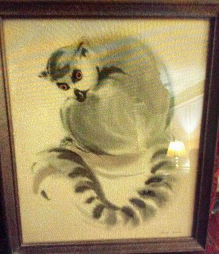 This is a framed art piece, appearing to be a high-quality lithograph or print of a watercolor painting depicting a ring-tailed lemur (Lemur catta). The artwork is the characteristic style of German painter Klaus Meyer-Gasters (1925-2016), known for his animalier subjects and expressive use of wet-on-wet technique. The lemur is rendered with soft, blurred edges and a muted color palette of cool greys, greens, and blacks, contrasted by distinct orange-red eyes and a long, banded tail that curls toward the foreground. The composition is set against a simple, light-toned background. The piece is housed in a dark wood frame with visible grain, likely stained oak or mahogany, and protected under a sheet of glass which shows significant reflection. There is a signature visible in the lower right corner appearing to read 'Meyer-Gasters'. The condition shows some slight yellowing of the paper consistent with age (mid-to-late 20th century) and minor surface wear to the frame. The print quality suggests a mid-century botanical/zoological illustration style, emphasizing both scientific accuracy and artistic fluidity.