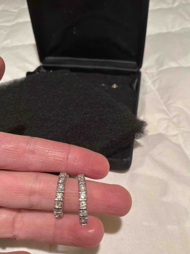 A pair of silver-toned hoop earrings, measuring approximately 15mm-20mm in diameter, featuring a consistent channel setting of round-cut gemstones, presumably diamonds. The metal appears to be white gold or platinum based on the high-luster finish and lack of visible tarnishing common in silver. Each earring contains multiple stones set in a vertical orientation along the front face of the hoop. The stones exhibit significant fire and brilliance, suggesting a high-quality cut and clarity. The construction utilizes a sturdy channel frame that protects the girdle of each stone, a design typical of 21st-century contemporary jewelry. The earrings appear to be in excellent condition with no missing stones and minimal surface micro-scratching on the metal components. The closure is not fully visible but likely consists of a hinged back or post-and-clutch system. These pieces are presented alongside a black velvet-lined jewelry box, indicating a standard retail luxury presentation. The overall craftsmanship shows precise alignment of the stones and clean, polished edges, characteristic of fine jewelry rather than costume pieces.