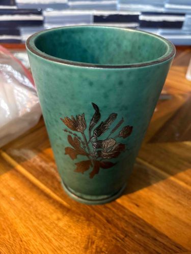 Mid-Century Teal Glazed Ceramic Tumbler with Silver Overlay Floral Motif