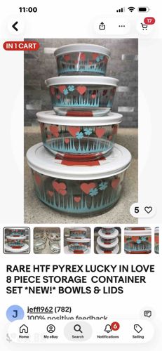This is a contemporary Pyrex storage set featuring the highly sought-after 'Lucky in Love' pattern. The set includes four circular clear glass containers of graduated sizes (typically 1-cup, 2-cup, 4-cup, and 7-cup capacities) with four matching white BPA-free plastic lids. The decorative pattern consists of vibrant coral-pink hearts and turquoise-blue four-leaf clovers situated above a turquoise grass line. This specific pattern is a modern reissue of the legendary and extremely rare 1959 prototype. The glass is non-porous borosilicate or soda-lime glass, designed to be oven, microwave, dishwasher, and freezer safe. The graphics appear sharp and saturated without visible fading or dishwasher etching. As the listing indicates the item is 'new,' the condition appears excellent with no visible chips, cracks, or staining on the glass, and the lids show no signs of warping or discoloration. The craftsmanship is consistent with modern World Kitchen/Corelle Brands production standards. This set is particularly desirable among modern Pyrex collectors due to the iconic status of the original 'Lucky in Love' design, making it a functional yet highly collectible kitchenware item.
