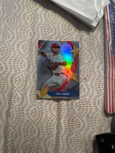 This is a modern collectible baseball trading card featuring Trea Turner of the Philadelphia Phillies. The item is part of the 'Stars of MLB' insert set, typically found in 2023 Topps Series 2 retail products. The card measures a standard 2.5 by 3.5 inches and is constructed from light cardstock with a specialized vacuum-metallized PET film layer that provides a rainbow 'refractor' holographic finish. The design showcases Turner in a fielding action pose against a stylized background containing large yellow and orange stars and red brushstroke flourishes. His name is printed in a blue banner at the bottom. Regarding condition, the card appears to be in raw, ungraded state. Visible imperfections include minor whitening or 'silvering' on the top and bottom right-hand edges, along with slightly soft corners, which is common for mass-produced foil inserts. The centering seems slightly weighted toward the left border. The surface exhibits the high-gloss vibrancy characteristic of modern Topps printing techniques. No autograph or serial numbering is visible on the front of the card. The Topps logo is located in the upper left corner, signifying its origin from the primary licensed MLB card manufacturer.