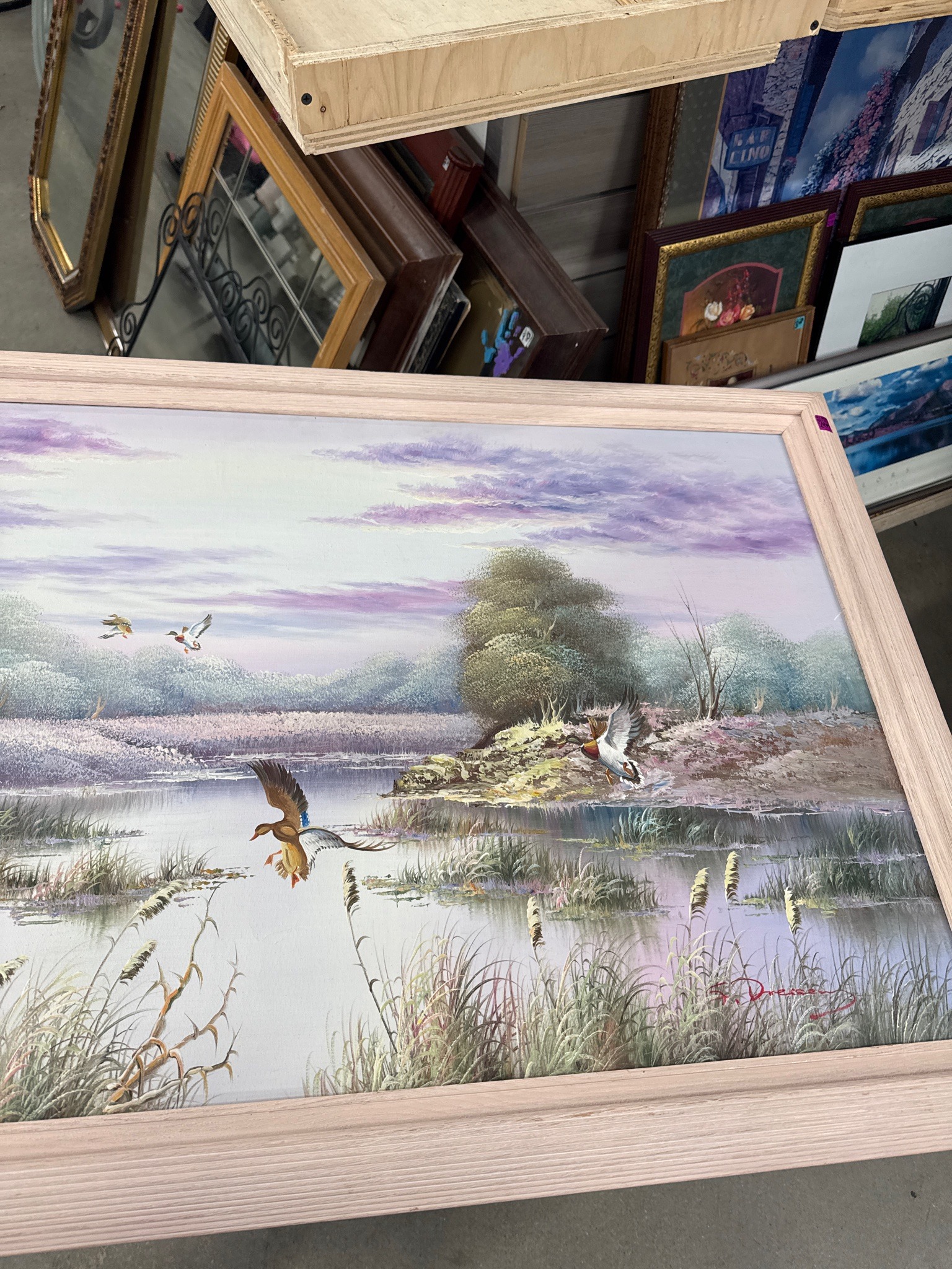 This is a large landscape oil painting on canvas from the late 20th century, specifically depicting mallard ducks in flight over a marshy wetland. The composition features four ducks realistically rendered against a dramatic sky filled with atmospheric purple and lavender clouds. The landscape includes a central body of water surrounded by tall reeds, cattails, and stylized deciduous trees. The color palette is dominated by soft pastels, purples, and muted greens. A notable feature is the painterly impasto technique used on the reeds and white water highlights, adding tactile texture to the surface. The piece is signed in red script in the lower right corner as 'F. Dresser' or similar. It is housed in a simple, flat-profile light wood frame with a natural grain finish. The condition appears sound with no visible tears or significant paint loss, though the frame shows some minor scuffing typical of handling. The style is indicative of decorative wildlife art popular in the 1970s and 1980s, often produced for commercial galleries or interior design markets. The brushwork shows a level of decorative efficiency rather than fine academic realism, typical of mass-produced yet hand-painted original art from this period.