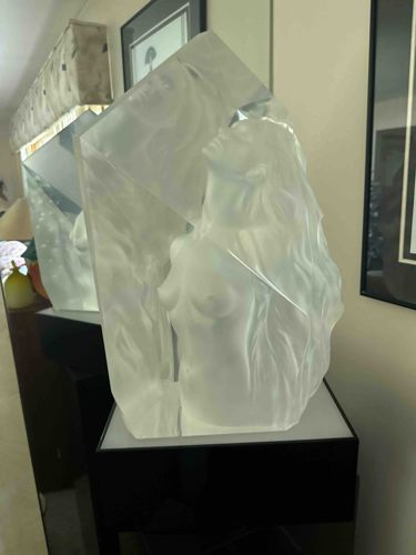 This is a substantial monolithic sculpture crafted from cast acrylic (often referred to by the trade name Lucite), likely produced by the Frederick Hart or Gallo studios, common in the late 20th century (circa 1980s-1990s). The piece features a clear, polished exterior with a frosted or 'acid-etched' internal figurative element depicting the torso of a woman with long flowing hair, looking upward. This 'negative space' casting technique creates a ghost-like, ethereal three-dimensional effect within the solid block. The sculpture is mounted on a custom black lacquer-style display pedestal that appears to be integrated with an internal lighting system to enhance the internal refraction of the acrylic. Physically, the piece is angular and geometric on the outside while organic on the inside. The craftsmanship is high, indicative of high-end decorative art from the Contemporary/Pre-Millennium era. Condition appears excellent with no visible internal fractures ('crazing') or significant yellowing, which are common issues with aged acrylic. Small surface scratches are not readily apparent but are expected on high-polish surfaces of this age. The scale is significant, suggesting it was designed as a focal point for a luxury interior.