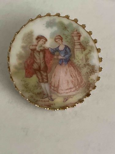 This is a circular porcelain brooch, likely of French origin from the mid-20th century. It features a transfer-printed Romantic scene in a Rococo style, depicting a courting couple in an outdoor garden setting. The figures are dressed in 18th-century attire; the man wears a wide-brimmed hat and a red coat, while the woman wears a pink gown and blue bodice. The scene is signed 'Fragonard' at the bottom left, a signature frequently used on porcelain to reference the style of the famed French painter Jean-Honoré Fragonard. The porcelain disc is encased in a gold-toned metal bezel featuring a decorative scalloped or 'dog-tooth' edge that secures the plaque. The image colors are soft pastels—pinks, blues, and greens—which are characteristic of the 'fête galante' aesthetic. Overall, the piece appears to be in good vintage condition, though the metal mounting shows minor signs of oxidation or wear consistent with age. There are no obvious chips or cracks visible on the convex porcelain surface. The quality suggests a mass-produced souvenir or gift item from the mid-1940s to the 1970s, modeled after the luxury porcelain traditions of Limoges.