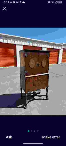 This is a tall, freestanding wooden cabinet, likely used as a liquor or beverage cabinet, dating from the early to mid-20th century. The piece features a two-tiered construction with a darker, rich wood finish, potentially walnut or mahogany veneer. The upper section consists of two large cabinet doors adorned with oval-shaped decorative relief carvings and a central hardware latch. These doors open to reveal an interior storage space. The lower section features a single, wide drawer or fold-down compartment with similar decorative relief work and a scalloped bottom edge. It is supported by four elegant cabriole-style legs that end in ball-and-claw feet, connected by a cross-stretcher for added stability. The hinges appear to be exposed metal, contributing to the furniture's decorative antique aesthetic. Visible condition issues include some surface scuffing and potential fading of the wood finish, particularly along the edges and lower trim, suggesting a natural patina consistent with age. There are no immediately visible maker's marks in this low-resolution image, but the overall craftsmanship and cabriole legs point toward a Revival or Queen Anne influence popular in 1920s-1940s American furniture design. The hardware appears original, though some tarnish may be present on the metal components.