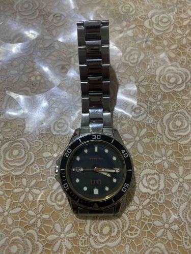 This item is a contemporary men's wristwatch featuring a hybrid analog-digital interface, designed in the aesthetic of a classic diver's watch. The timepiece is constructed from brushed and polished stainless steel with a circular case and an integrated three-link oyster-style bracelet. The watch face is black, adorned with luminescent geometric hour markers (dots and a shield at 12 o'clock) and a secondary digital display window at the 6 o'clock position showing '0:00'. It features a distinctive unidirectional rotating black bezel with silver Arabic numerals at intervals of 10. The hands are baton-style with luma-fill, including a prominent gold-toned second hand. While mimicking high-end tool watches, the craftsmanship suggests a mid-market fashion quartz movement. The condition shows visible signs of regular wear, including superficial scratches (swirlies) on the polished center links of the band and bezel edges. The crystal appears intact but may have light scuffing consistent with age. There are no visible maker marks on the dial in this view, though it likely dates from the late 20th to early 21st century. The overall aesthetic combines utilitarian functionality with urban sporty style.