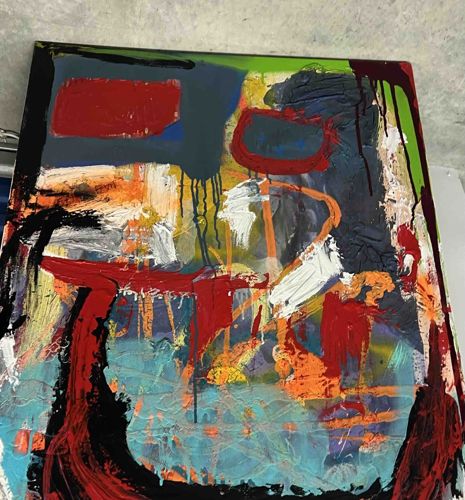 This is an original contemporary abstract expressionist painting on canvas, measuring 30x40 inches. The composition, titled 'Mask', features a heavy, gestural application of paint with a vibrant and high-contrast color palette of crimson red, deep sapphire blue, bright orange, and lime green, offset by stark black and white accents. The work demonstrates significant impasto techniques, suggesting the use of palette knives and thick brushwork to create a textured, three-dimensional surface. Visible drips and splatters indicate an action-painting influence, notably in the center-top and left regions where black and red pigments have trailed down the canvas. The canvas is gallery-wrapped or fixed to a standard rectangular stretcher. The condition appears to be excellent with no visible cracking (craquelure), fading, or structural warping. The style is heavily influenced by mid-20th-century Neo-Expressionism, characterized by visceral raw energy and a non-representative, emotive structure. Despite the title 'Mask,' the imagery remains largely non-objective, though the central red and black voids evoke skeletal or structural features. There are no immediate signatures visible on the face of the work, suggesting it may be signed on the reverse. Dated 12/2025, this represents a very modern, post-millennial piece of fine art.
