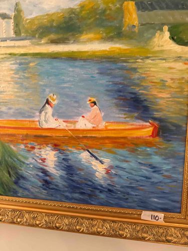 This is an oil or acrylic painting on canvas executed in a late 19th-century Impressionist style, closely reminiscent of works by artists like Claude Monet or Pierre-Auguste Renoir. The scene depicts two figures in traditional period attire—likely a man and a woman wearing straw boaters—seated in a yellow wooden rowboat on a body of water. The composition is defined by loose, dabs of broken color and visible impasto brushwork, particularly in the shimmering reflections on the blue and white water. The palette consists of vivid blues, yellows, oranges, and greens, suggesting a bright, sunlight-drenched atmosphere. The background shows a grassy bank with blurred architectural or industrial elements in the upper left, potentially indicating a suburban river setting like Chatou or Asnières. The work is housed in a contemporary ornate gilded frame featuring a bead-and-reel pattern and leaf motifs. A small adhesive price or lot tag labeled '110-' is visible in the lower right corner. The condition appears stable with no immediate signs of flaking, though a professional inspection under UV light would be required to determine if this is an authentic period piece, a high-quality 20th-century homage, or a reproduction.