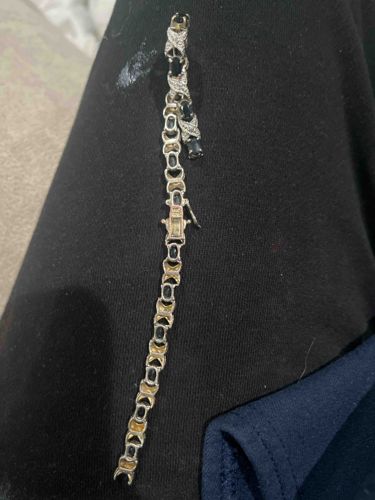 This is a tennis-style link bracelet featuring an alternating 'X' and 'O' pattern, commonly referred to as a 'hugs and kisses' design. The bracelet is constructed with oval-cut dark gemstones, likely natural or lab-created blue sapphires, set in four-prong 'O' mountings. Interspersed between these stones are silver-toned 'X' links, which appear to be set with small diamond accents or pavé-set melee crystals. The metal appears to be sterling silver or white gold-plated brass, showing significant signs of wear and tarnish, especially on the underside where yellow-toned base metal may be showing through. The construction features a series of articulated hinges for flexibility. The fastening mechanism is a box clasp with a single figure-eight safety latch, indicating a late 20th-century manufacture, likely the 1980s or 1990s. One segment of the bracelet is detached, suggesting a break in the hinge pins or a structural failure in the linkage. The overall craftsmanship is consistent with mass-produced fine or bridge jewelry from a retail department store. Surface scratches and accumulated debris are visible on the stone facets and metal settings.