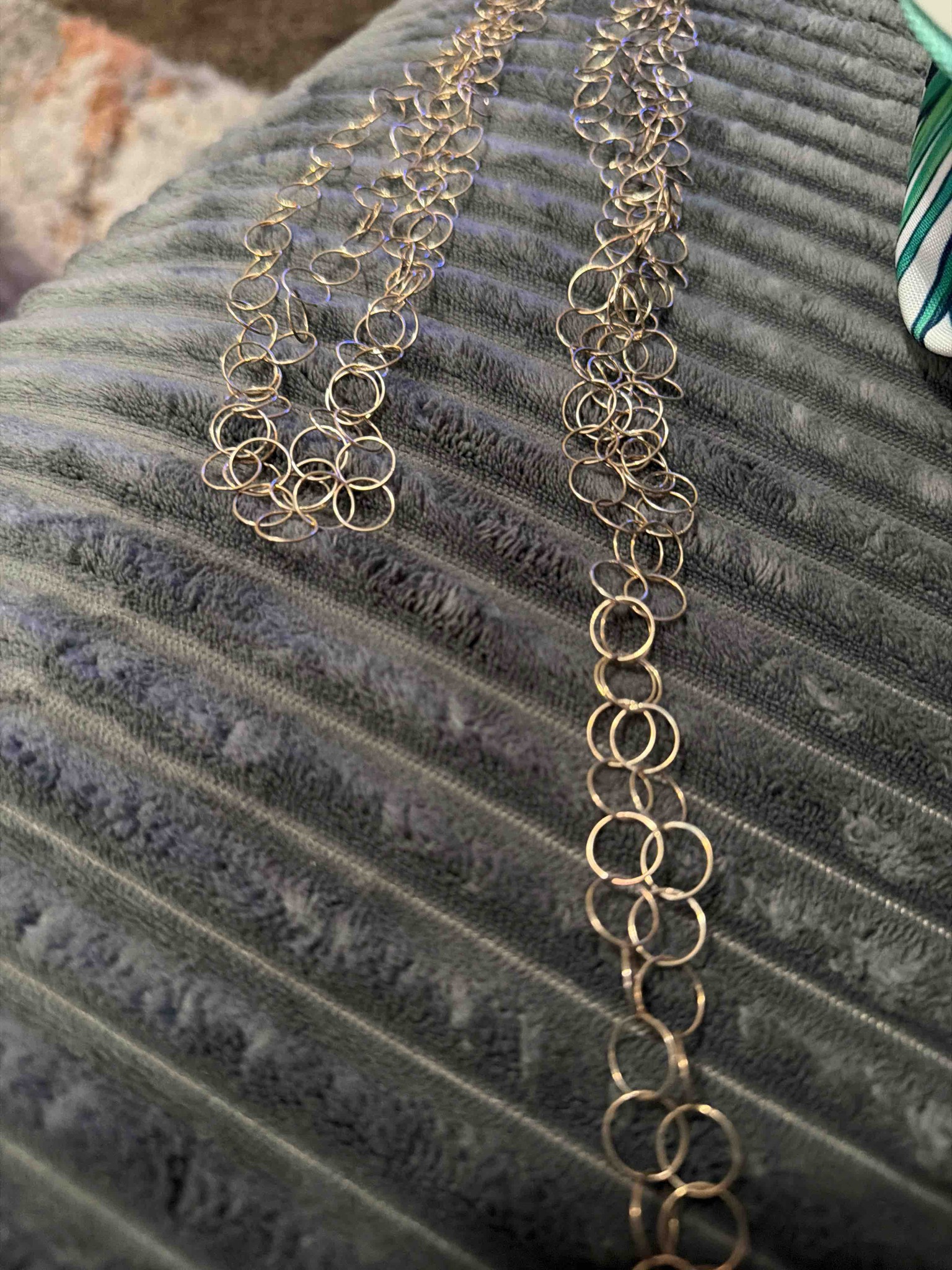This item is an intricately constructed fashion necklace or decorative chain featuring a repetitive, organic pattern of interlocking metal rings. The design is characterized by multiple interconnected circles of varying or uniform sizes, creating a 'bubble' or grape-cluster effect along the length of the chain. Based on the visual evidence, the item appears to be made of a polished metal, likely gold-toned or yellow gold-filled wire. The construction consists of fine, circular hoops that have been hand or machine-linked to build volume rather than a single flat strand. The finish has a bright, reflective quality, though subtle signs of age and wear are present, primarily in the form of minor surface scratches and slight tarnishing in the recessed areas where the links meet. No visible designer hallmarks or purity stamps are immediate, suggesting they may be located on a clasp not shown in the frame. The style is contemporary to late 20th century, favoring a bohemian or modern minimalist aesthetic. The craftsmanship exhibits a delicate balance between fine wire-work and structural durability, though the thin gauge of the rings suggests it requires careful handling to avoid tangling or warping of the circular shapes.