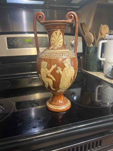 This item is a ceramic decorative vase styled after an ancient Greek volute krater, though its size and high-gloss finish suggest it is a 20th-century decorative replica. The vessel is constructed from terracotta-colored clay with a polished or lacquered finish that mimics a wood-grain or high-fire glaze patina. It stands on a stepped pedestal base and features two prominent, elongated vertical handles that terminate in volute (scroll) curls at the rim. The decoration is executed in a 'Red-figure' inspired style using cream-colored slip or paint. A large palmette motif adorns the neck, while a Greek key (meander) border encircles the shoulder. The main body depicts a figurative scene of a seated male figure and a standing female figure in classical attire, possibly depicting a mythological scene or a libation offering. The craftsmanship shows mass-production characteristics, likely intended as a souvenir or home decor item from the mid-to-late 20th century. Condition appears fair to good with some minor surface abrasions and dust accumulation; no major cracks or structural repairs are visible from the primary angle, though the sheen suggests a contemporary protective coating rather than an ancient matte finish.