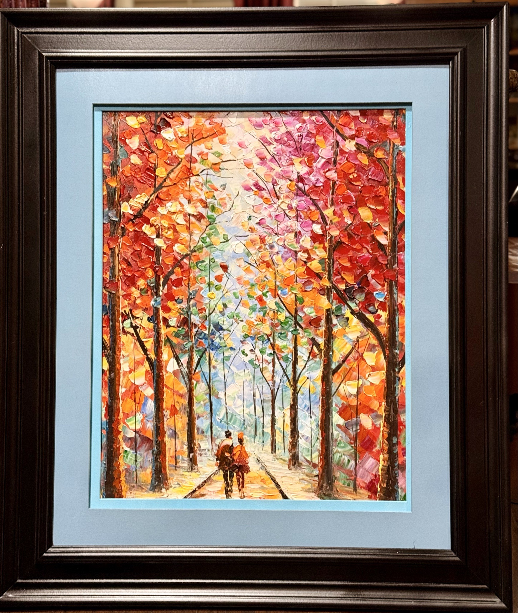 This is a contemporary oil or acrylic on canvas painting executed in a vivid modern impressionist style, frequently associated with the palette knife techniques of artists like Leonid Afremov. The artwork depicts two figures walking down a central path or alleyway flanked by a dense row of trees. The foliage is rendered in jewel-toned highlights of crimson, ochre, amber, and touches of cerulean blue, applied with heavy impasto that creates a tactile, three-dimensional texture. The perspective leads the eye toward a bright, ethereal point of light at the center. The painting is professionally mounted with a light blue inner mat and set within a wide, dark-stained wooden frame featuring beveled detailing. The condition appears excellent with no visible craquelure, paint loss, or fading, suggesting a late 20th to 21st-century origin. The craftsmanship is characterized by bold, confident strokes and a high-contrast color palette, aimed at creating a warm, nostalgic atmosphere typical of contemporary decorative fine art.