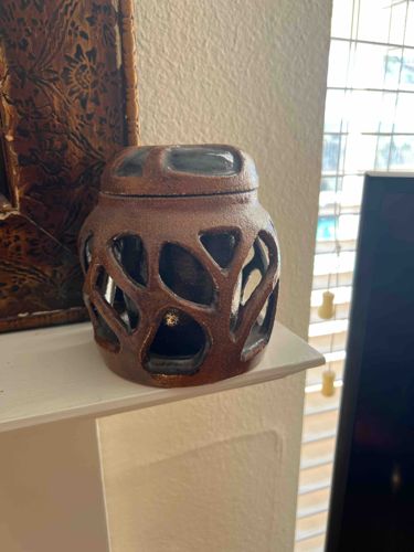 This item is a small, hand-crafted decorative ceramic vessel featuring a distinctive two-part construction with a reticulated outer shell. The piece is finished in a textured, matte bronze or earthy brown glaze that mimics the appearance of weathered metal or cast iron. The outer wall is characterized by irregular, organic cutouts that create a web-like or skeletal lattice, revealing a secondary inner cylindrical chamber finished in a complementary dark or metallic glaze. The vessel is topped with a matching domed lid, which also features rounded rectangular cutouts. The craftsmanship suggests a mid-to-late 20th-century modernist or brutalist aesthetic, focusing on textural contrast and the interplay between solid mass and void space. Physically, the object appears to be approximate 5-7 inches in height. Condition-wise, the glaze shows some slight wear and minor surface abrasions consistent with age and handling, but no significant chips or structural cracks are immediately visible. The organic, freehand nature of the cutouts indicates a hand-carved process rather than mold-casting, pointing toward a studio pottery origin.