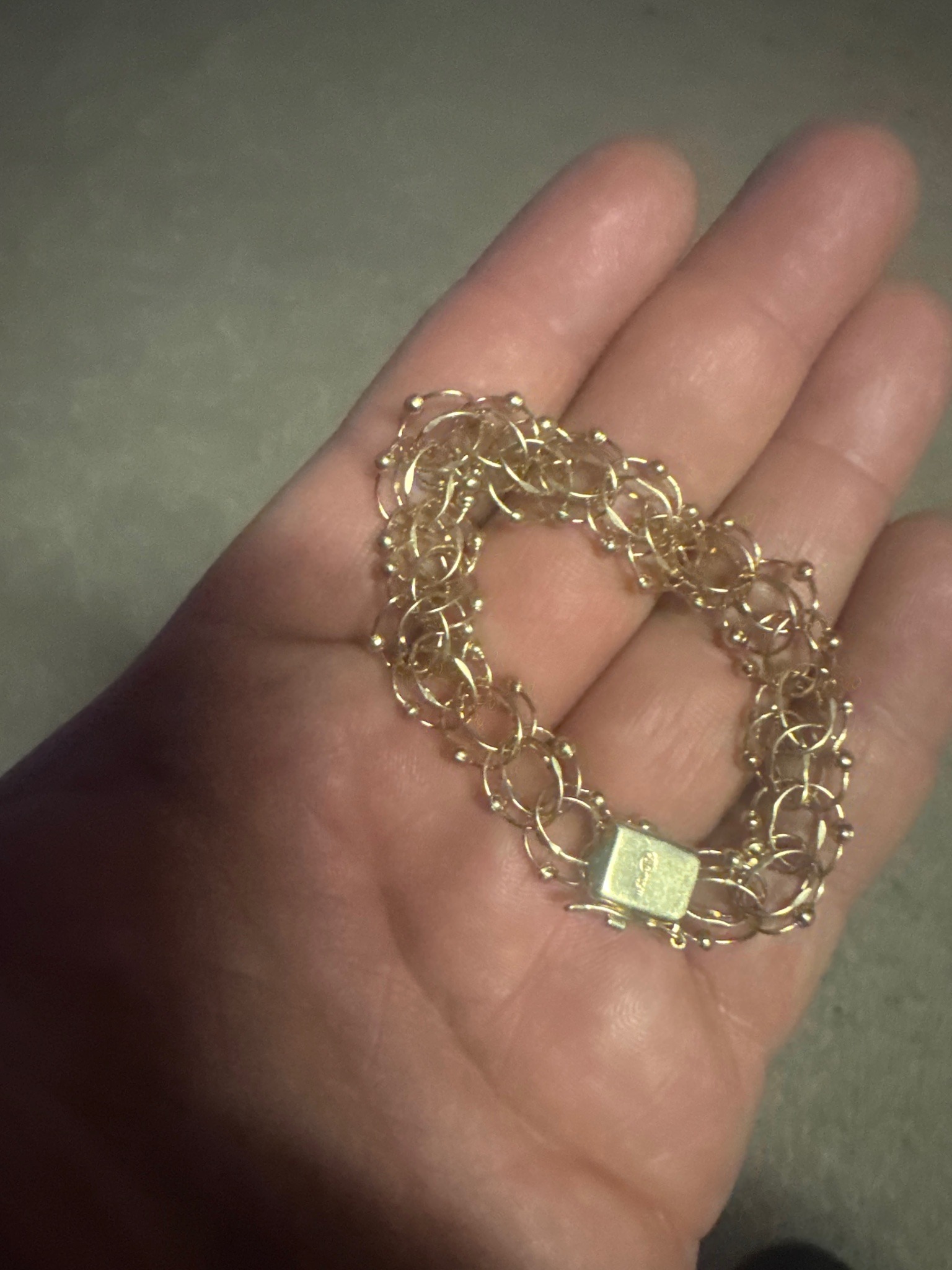 This item is a multi-strand chain bracelet, likely composed of three to four parallel rows of interlocking round and oval links. It appears to be crafted from a yellow-tone metal, possibly 14k or 18k yellow gold, though a professional acid test or hallmark verification would be required to confirm the alloy. The design is distinctive, featuring small spherical beads or 'granules' integrated into the outer links, giving it a textured, lace-like appearance. The construction is elaborate, with numerous small solder points where the links meet, indicating a decorative mid-20th-century style, approximately 1950s to 1970s. The piece is secured by a significant rectangular box clasp with a textured finish. A notable feature is the faint visible marking on the clasp, which likely indicates the gold purity or the manufacturer's mark. In terms of condition, the bracelet shows some signs of age-appropriate wear, including light surface scratches on the clasp and a soft patina in the crevices of the links. There are no obvious broken links or missing beads visible in the current view. The craftsmanship displays a high level of detail, characteristic of fine jewelry rather than costume pieces, suggesting it may have a substantial gold weight and intrinsic value.
