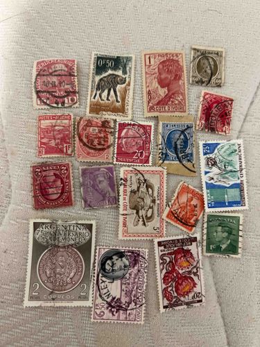 A diverse grouping of nineteen used postage stamps from various international locations spanning the mid-20th century. The collection features a wide array of origins including Argentina, Côte d'Ivoire (A.O.F.), Mauritanie, Canada, Germany (Deutsche Bundespost), and the Central African Republic. Physical characteristics include standard perforated edges on lightweight paper, with colors ranging from monochrome sepia and magenta to vibrant multi-colored lithographs. Notable themes depicted include wildlife (a hyena from Mauritania), political figures (King George VI of Canada), local flora, and commemorative events such as the 75th Anniversary of the Argentine Mint. Condition is varied; nearly all specimens exhibit prominent circular postal cancellations in black ink, indicating they are postally used. Several stamps show physical wear, including blunted perforations, light creasing, and one specimen remains attached to its original envelope paper (on piece). The craftsmanship reflects various printing methods of the era, from fine line engraving to modern offset printing. This collection represents the 'Golden Age' of mid-century philately, showcasing the aesthetic and geopolitical transitions of the post-WWII period.