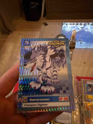 This is a vintage Digimon trading card featuring the character Garurumon, designated as card number 18. The card is a standard-sized trading card with a distinctive 'prism' or 'diamond' holofoil finish that covers the entire front surface, creating an iridescent, multi-color light-catching effect. The artwork depicts the wolf-like 'Champion Digimon' in its classic white and blue-striped design with purple claws. The card includes a blue border, the 'Digimon' logo in the top right, and a 'DP 300' stat box in the bottom right corner. The lower text confirms its classification as a 'Champion Digimon.' Construction appears to be high-gloss laminated cardstock typical of late 1990s or early 2000s collectibles. From the image, the card shows minor signs of handling, including slight silvering or chipping along the top left edge and potentially some light surface scratching common with holofoil finishes of this era. The corners show minor wear but appear relatively sharp. This style of holofoil card was often associated with early international releases or promotional sticker card sets produced by Bandai or under license by companies like Upper Deck or Topps during the peak of the Digimon animated series popularity around 1999-2001.