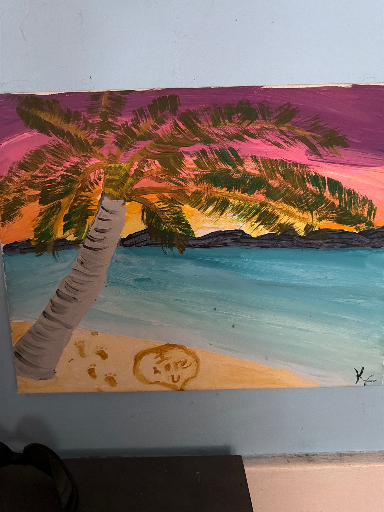 This is an original landscape painting executed in acrylic on canvas, depicting a tropical beach scene at sunset or sunrise. The composition is anchored by a large, leaning palm tree on the left, rendered in shades of grey with horizontal band textures, supporting a crown of dark green and ochre fronds. The background features a vibrant sky transitioning from a deep magenta/purple at the top down through pink, orange, and golden yellow hues. A dark navy or black mountain range sits on the horizon, overlooking turquoise and light blue water. The foreground shows a sandy beach with small, brownish details that appear to be footprints and a heart shape containing the text 'LOVE U' drawn in the sand. The artwork exhibits expressive, visible brushwork and a thick application of paint (impasto) in several areas, particularly the sky and foliage. A small monogram or signature consisting of the initials 'KK' is visible in the bottom right corner. The painting is unframed and appears to be contemporary folk or amateur art. Condition looks stable, though some minor paint thinning is visible near the upper-right edge and some surface dust may be present. The execution suggests a novice to intermediate level of craftsmanship, focusing on color saturation and symbolic imagery.