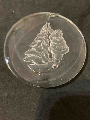 This is a circular, flat-disc holiday ornament meticulously crafted from high-clarity lead crystal, likely produced by the renowned Belgian glassworks Val St. Lambert. The ornament features a central frosted or acid-etched intaglio depiction of Santa Claus placing a star atop a stylized Christmas tree. The reverse side of the etching creates a three-dimensional effect when viewed through the polished front surface. The crystal disc is approximately 3 to 3.5 inches in diameter with a smooth, rounded edge. The etching demonstrates high-quality craftsmanship, with fine details visible in Santa’s beard, his belted suit, and the textured tiers of the evergreen tree. There is a small integrated suspension hole at the top, currently holding a simple silver-toned wire hook. The condition appears fair to good; while the central motif remains crisp, there are visible surface scuffs and minor abrasions consistent with seasonal use and improper storage. No significant chips or cracks are immediately apparent at the edges. Based on the style and subject matter, this piece likely dates from the late 20th century, specifically the 1980s or 1990s, a period when such commemorative crystal ornaments were popular luxury collectibles.