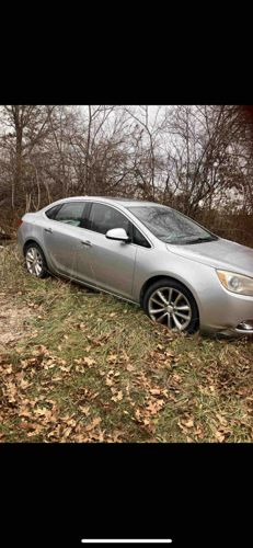 This is a four-door sedan, identified as a Buick Verano, finished in a metallic silver exterior paint. The car features a modern aerodynamic design characteristic of the early-to-mid 2010s. Notable physical features include multi-spoke alloy wheels, body-colored side mirrors with integrated turn signals, and chrome accents around the window trim and front fog light housings. The vehicle appears to be equipped with a sunroof. The craftsmanship is typical of General Motors' compact luxury segment, featuring integrated headlight assemblies with amber indicators. Regarding condition, the car is currently positioned off-road in a grassy area with fallen leaves, which suggests it may be stuck or abandoned. The front passenger-side wheel is deeply embedded in the soft soil. There is visible fogging or oxidation on the headlight lenses, which is a common aging factor for this model. The overall body integrity appears intact from this angle, though the lower front bumper may be in contact with the terrain. No visible manufacturer's badges are directly readable in this low-resolution image, but the distinct waterfall grille contour and body lines are diagnostic of the Buick brand.