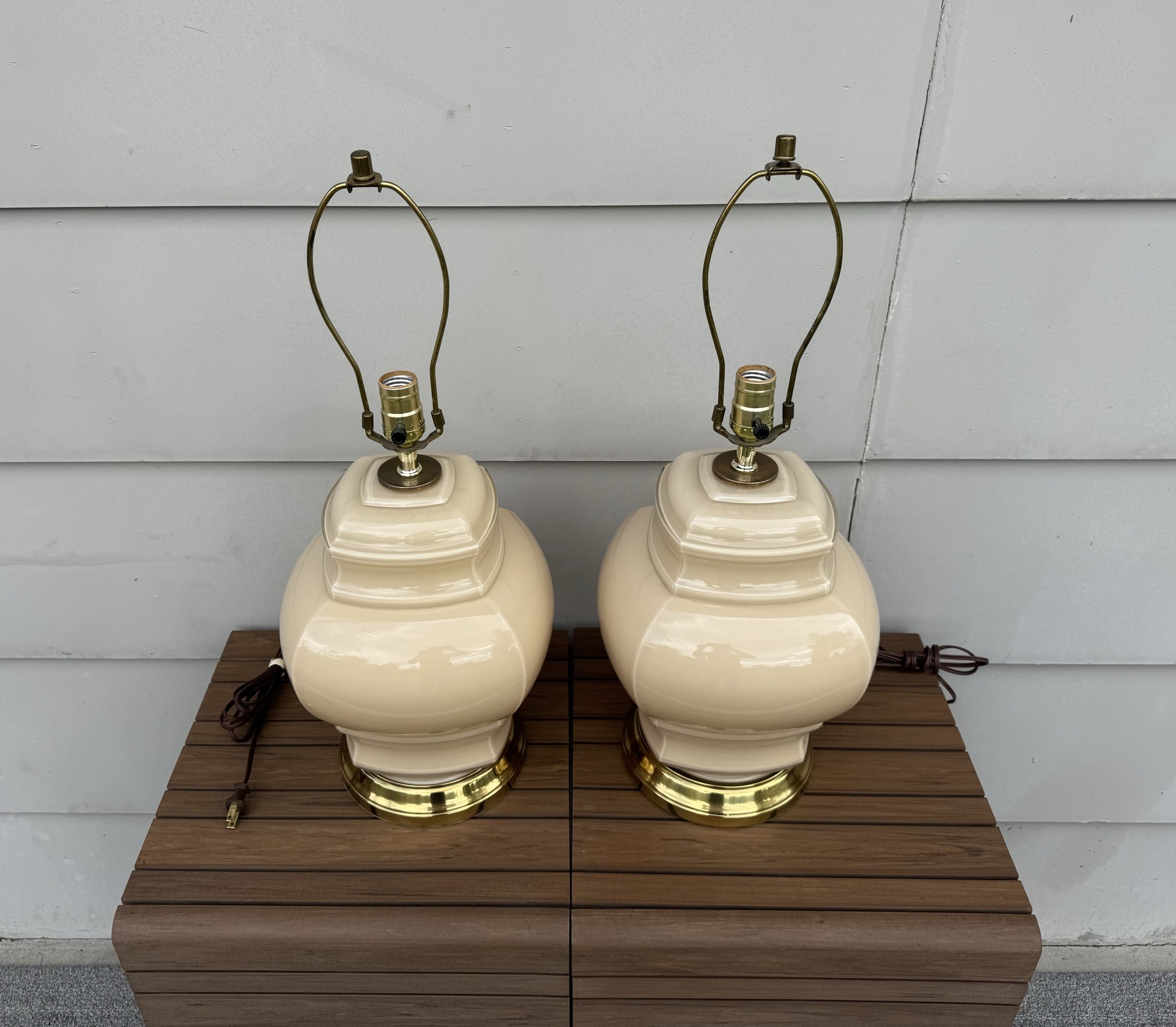 This is a matching pair of table lamps featuring a classic ginger jar or 'temple' silhouette, characterized by a bulbous mid-section and a stepped rectangular neck. The bodies are constructed from high-quality ceramic finished in a glossy, opaque cream or off-white glaze that reflects light evenly. Each lamp is mounted on a circular, stepped brass-plated metal pedestal base with a polished gold-tone finish. The electrical hardware consists of a standard brass socket with a push-through switch, secured by a decorative brass harp and matching finial at the top. The overall design language suggests an American Mid-Century Modern or Hollywood Regency aesthetic, likely dating from the 1960s to early 1980s. The craftsmanship is indicative of high-end manufacturers from that era, such as Stiffel or Laurel. Regarding condition, the ceramic bodies appear to be in excellent structural shape with no visible cracks, chips, or crazing. The brass plating on the bases shows minor surface oxidation and light scuffing consistent with age, while the electrical cords are brown, two-prong varieties that appear original and flexible. Note that lamp shades are currently missing from the assembly.