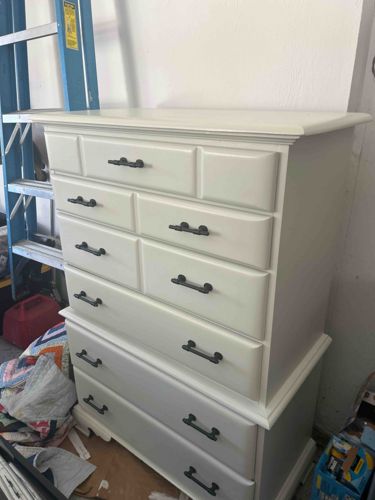 This is a vertical wooden chest of drawers, often referred to as a tallboy or highboy, featuring an 'upcycled' or refurbished aesthetic. The piece is constructed with seven drawers in a tiered configuration: one full-width top drawer, three pairs of split drawers, and two deep full-width bottom drawers. The exterior has been refinished in a matte off-white or light cream paint, which appears to be a modern chalk or mineral-style finish used to revitalize older timber furniture. The drawer fronts feature raised beveled panels, adding dimension and a traditional touch. Contrast is provided by modern, dark oil-rubbed bronze or matte black metal 'barn-style' pull handles, which replace original hardware. The top surface has a classic ogee-style molded edge, and the base is finished with a decorative scalloped apron and bracket feet. Based on the silhouette and construction style, this is likely a mass-produced pine or maple piece from the 1970s or 1980s, originally finished in a dark stain. The condition appears structurally sound with a clean, updated surface, though slight unevenness in the paint application and proximity to storage items suggest it is a DIY refurbishment projects. The craftsmanship is typical of high-quality consumer-grade furniture of its era, intended for durability and functional bedroom storage.
