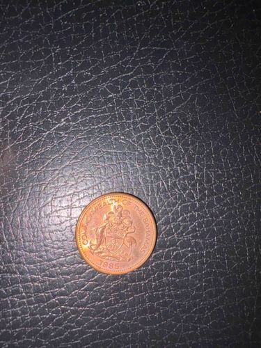 This is a single 1985 one-cent coin from the Commonwealth of the Bahamas, contrary to the user-provided context suggesting a 1957 roll. The obverse side shown features the national Coat of Arms, which includes a marlin and a flamingo supporting a shield topped by a conch shell. The text 'COMMONWEALTH OF THE BAHAMAS' arcs over the top, with the year '1985' located at the bottom. The coin is composed of copper-plated zinc, exhibiting a reddish-brown metallic luster characteristic of this alloy. It measures approximately 19mm in diameter with a plain edge and a weight of roughly 2.5 grams. Condition-wise, the coin appears to have moderate circulating wear, showing some surface scratching and mild darkening or oxidation (patina) across the fields and high points of the crest. There is a cluster of deeper abrasions or minor corrosion near the 10 o'clock position on the rim. The strike remains clearly legible, though the finer details of the shield and feathers show some flattening from use. This piece represents modern Bahamian decimal currency following their independence and transition to the Bahamian dollar system.