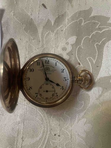 This is a vintage gold-toned (likely gold-filled or rolled gold) hunter case pocket watch, featuring a signature white enamel or porcelain dial. The dial is printed with bold black Arabic numerals and a peripheral minute track. Notable branding located below the 12 o'clock position includes 'T. Fattorini & Son,' along with an elaborate coat of arms or crest and the location 'Skipton,' a town in North Yorkshire, England. This suggests the piece was manufactured or retailed by the well-known Fattorini family of clockmakers, active in the late 19th and early 20th centuries. The watch features ornate black spade-style hands and a dedicated sub-seconds dial at the 6 o'clock position. The case is a front-opening 'hunter' style, operated by a crown and bow at the 3 o'clock position, though the watch is oriented for use in a vertical position. Regarding condition, there is visible superficial wear and light tarnishing or patina on the metal casing, particularly visible on the inner surface of the open lid. The dial appears mostly clean, though the presence of hairline cracks (crazing) is common for enamel dials of this age. The craftsmanship is indicative of high-quality British horology from roughly 1890 to 1920, characterized by robust mechanical construction and elegant typography.