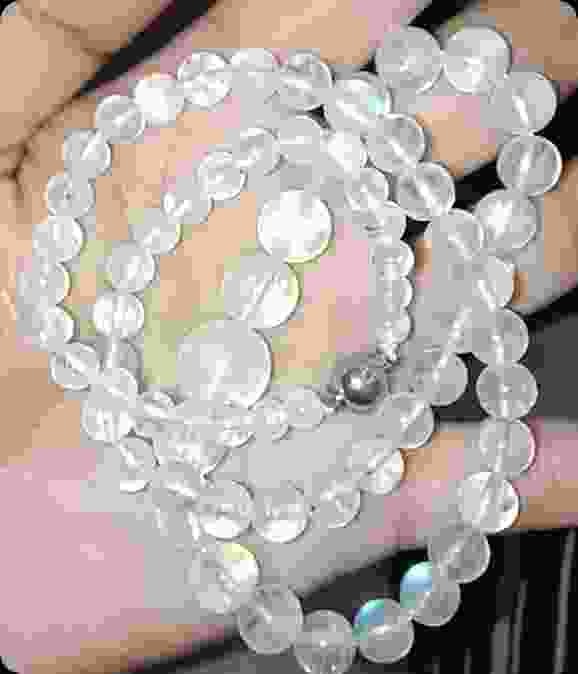 This jewelry piece consists of a multi-strand or long continuous strand of polished gemstone beads. The primary material appears to be clear quartz (rock crystal), characterized by its high transparency and vitreous luster. Interspersed within the strand are specific beads exhibiting adularescence—a shimmering blue and white play of light—which strongly suggests the presence of rainbow moonstone (labradorite). The beads are spherical and vary slightly in size, generally ranging between 6mm and 10mm in diameter. The construction features beads strung on a flexible cord with a metallic, possibly silver-toned, magnetic or barrel-style clasp visible near the center. In terms of condition, the stones appear well-polished with few visible external fractures, though internal inclusions and 'veils' typical of natural quartz are present. There are no obvious signs of heavy wear or significant chipping on the surfaces of the beads. The overall style is contemporary and minimalist, emphasizing the natural beauty of the minerals. The craftsmanship is standard for modern semi-precious beadwork, utilizing uniform drilling and high-quality surface finishing to enhance the optical properties of the moonstone accents.